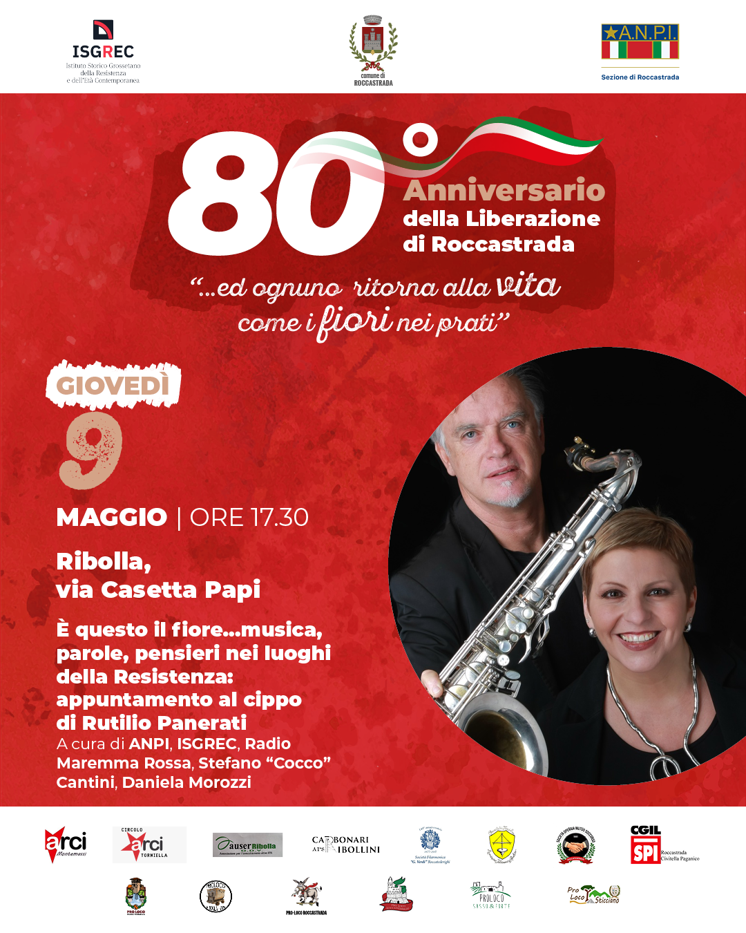 Giovedi 9 maggio alle ore 17.30 in Via Casetta Papi a Ribolla “E’ questo il fiore...” musica, parole, pensieri nei luoghi della Resistenza: appuntamento al cippo di Rutilio Panerati. L’evento è organizzato a cura di ANPI, ISGREC ed il patrocinio del Comune di Roccastrada, con la collaborazione di Radio Maremma Rossa, Stefano “Cocco” Cantini e Daniela Morozzi.