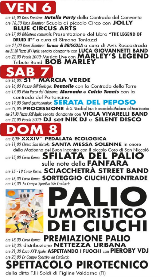 Sabato 7 settembre, alle ore 16.00 51° MARCIA VERDE ed alla stessa ora in Piazza dell’Orologio Donzelle con la contrada della Torre. Alle 17.00 nella pista del Parco del Chiusone Merenda e calcio tennis con la contrada del Portoncino. Alle 19.00 allostand gastronomico “Serata del peposo”; alle 21.00 Processione da S.Niccolò al Terzo in onore della Madonna del Buon Incontro; alle 21.30 in Piazza XXV Aprile serata danzante con Viola Vivarelli Band ed alle 22.00 in chiusura di serata a Poccia 2000 DJ set NIK DJ e silent disco.