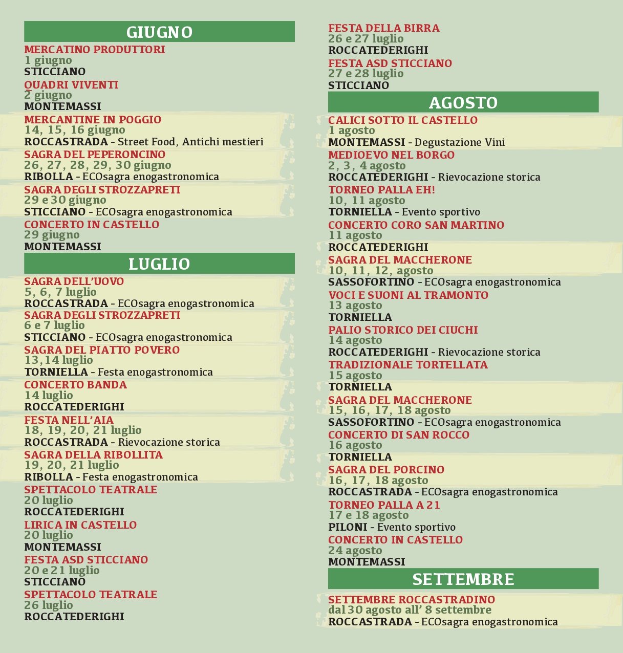 Sticciano Scalo ospita invece sabato 27 e domenica 28 luglio, per il secondo fine settimana, presso la struttura polivalente di Sticciano Scalo in Via Vecchia, la 2° “Sagra dello Gnocco e del Tortello nel Pallone” con ristorante aperto dalle ore 19,30. La sagra è organizzata dall’Associazione Sportiva Dilettantistica Sticciano con la collaborazione della Pro Loco Sticciano ed il patrocinio del Comune di Roccastrada.