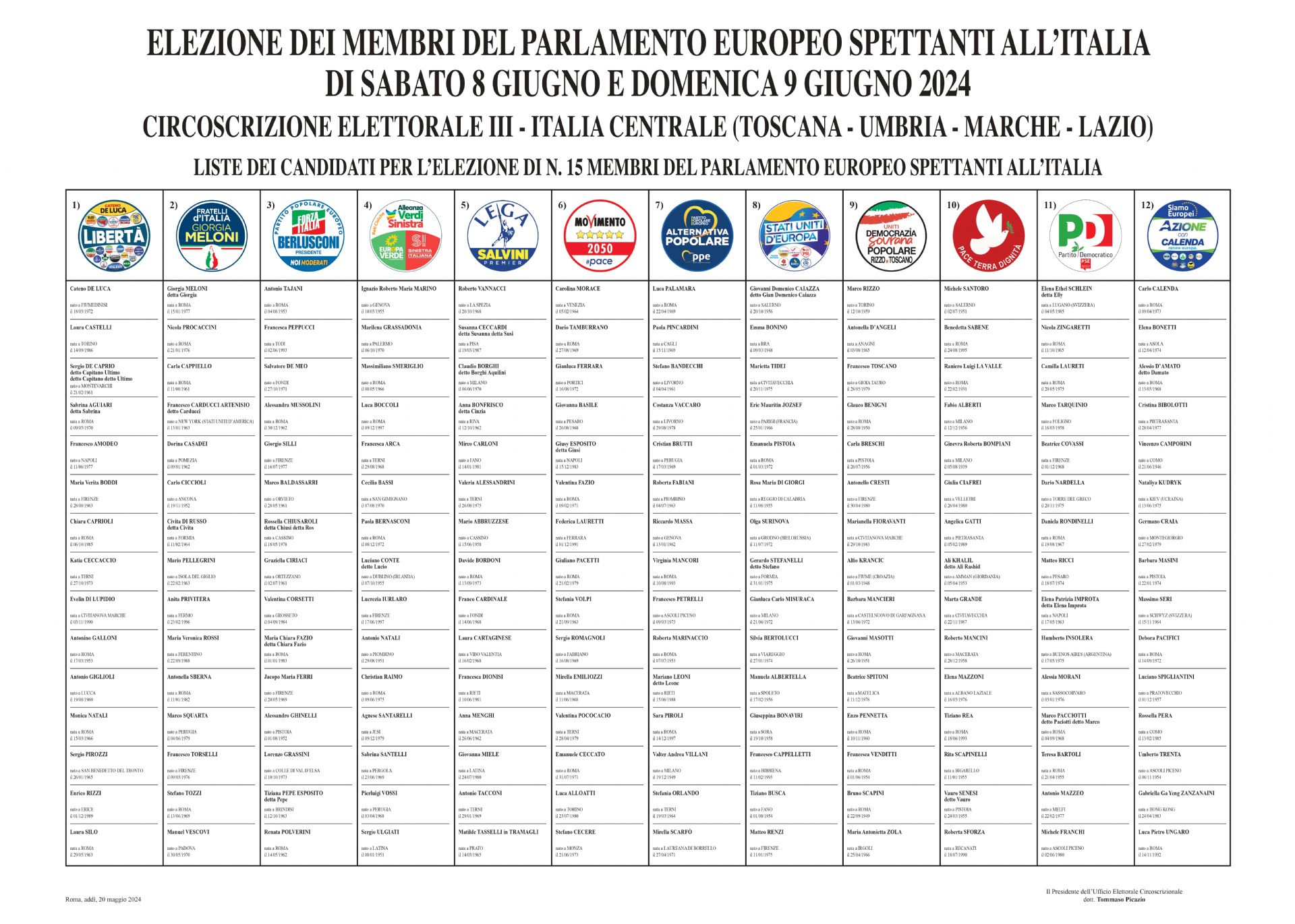 Liste dei candidati per l'elezione di n. 15 membri del Parlamento Europeo spettanti all'Italia