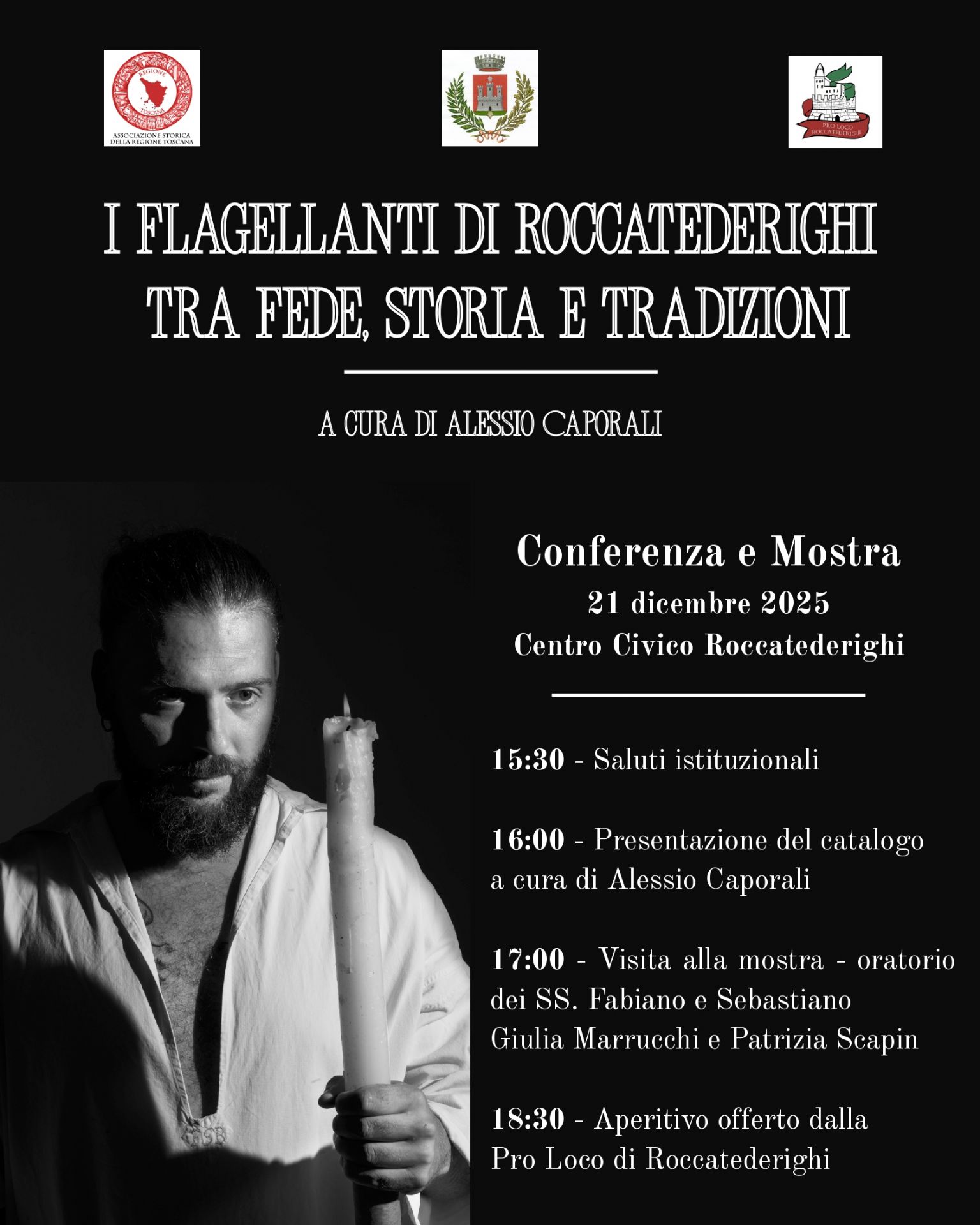 Domenica 21 dicembre a partire dalle 15.30 al Centro Civico di Roccatederighi, conferenza e mostra dal titolo “I flagellanti di Roccatederighi tra fede, storia e tradizioni”. L’evento prevede oltre ai saluti istituzionali, la presentazione del catalogo a cura di Alessio Caporali, la visita alla mostra-oratorio ed un aperitivo finale offerto dalla Pro Loco di Roccatederighi.