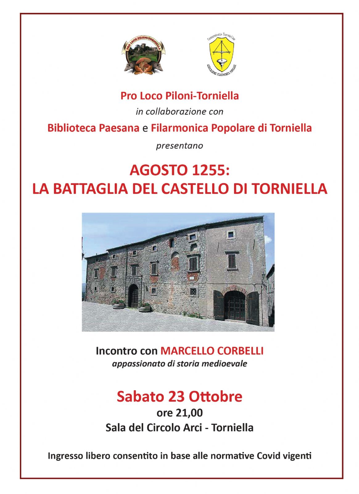 La Pro Loco Piloni - Torniella in collaborazione con la biblioteca paesana e la Filarmonica Popolare di Torniella presentano "Agosto 1255: La battaglia del castello di Torniella", incontro con Marcello Corbelli appassionato di storia medievale.