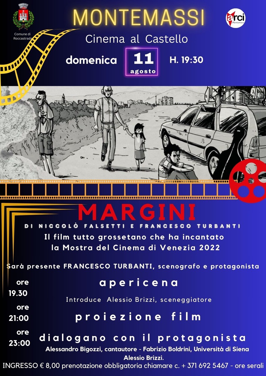 Domenica 11 agosto, a Montemassi, nell’ambito del cartellone degli eventi estivi promosso da ARCI MONTEMASSI con il patrocinio del Comun di Roccastrada, sarà proiettato "MARGINI", il film interamente girato a Grosseto da Niccolò Falsetti e Francesco Turbanti. Chi lo avesse perso o chi vuole rivederlo, questa è un'ottima occasione per farlo, in compagnia dello scenografo e protagonista Francesco Turbanti.