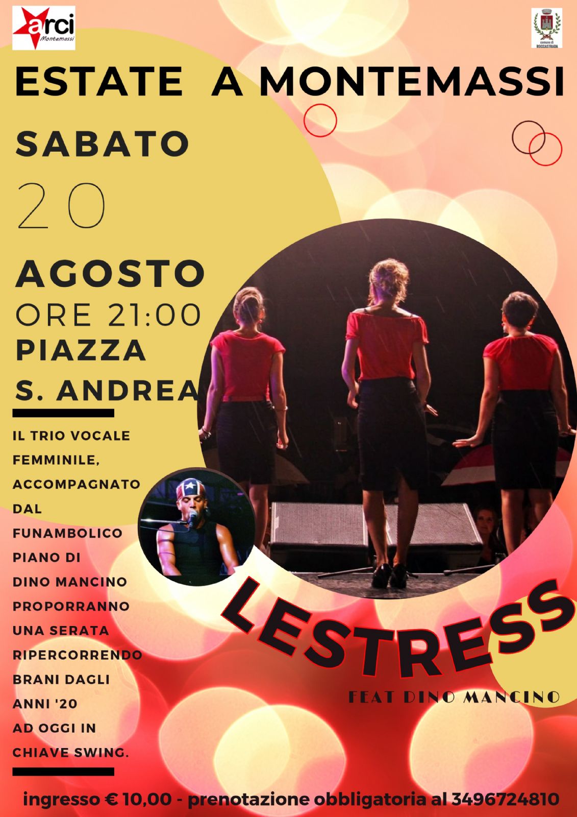 Sabato 20 agosto alle ore 21.00 in Piazza S.Andrea, il cartellone "Estate a Montemassi" presenta "Le stress - Feat Dino Mancino". Il trio vocale femminile, accompagnato dal funambolico piano di Dino mancino, proporranno una serata ripercorrendo brani dagli anni 20 ad oggi in chiave swing.