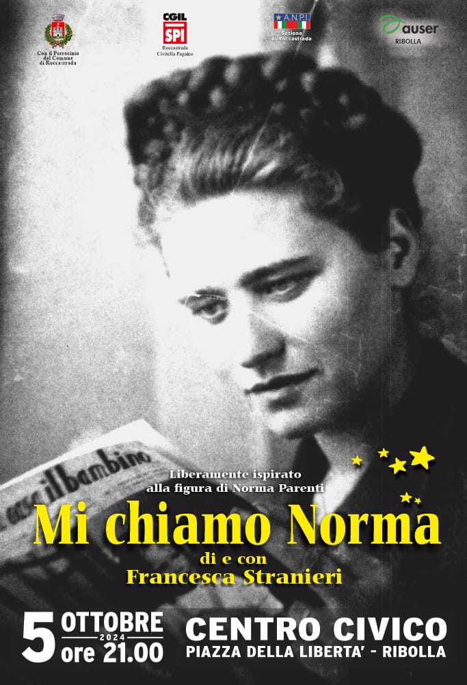 Sabato 5 ottobre 2024 alle ore 21.00 al Centro Civico in Piazza della Libertà a Ribolla, rappresentazione teatrale sulla vita della Partigiana Medaglia d'oro Norma Parenti, scritta ed interpretata da Francesca Stranieri.