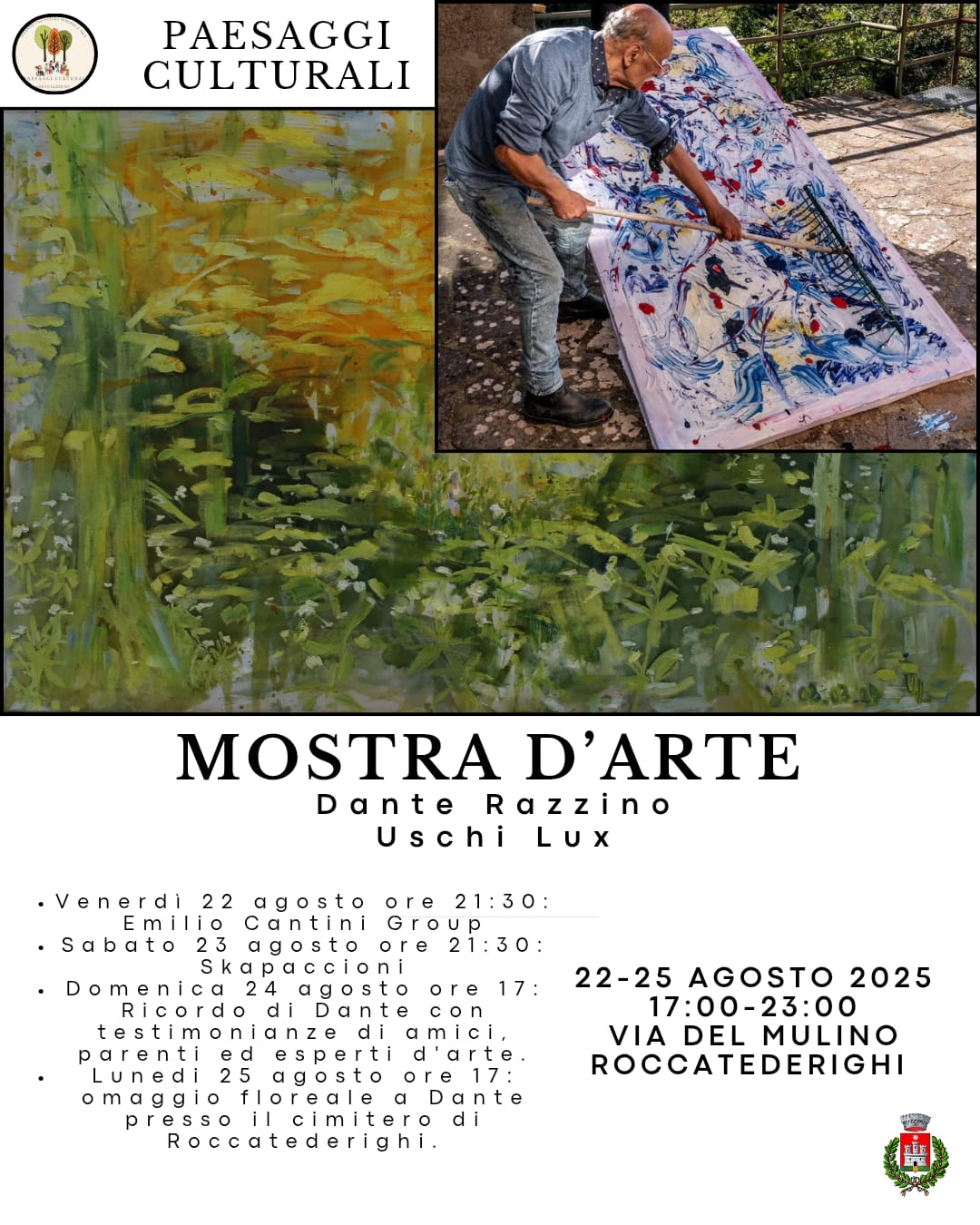 L'associazione Paesaggi Culturali di Roccatederighi, con il patrocinio del Comune di Roccastrada, organizza in Via del Mulino a Roccatederighi nei giorni dal 22 al 25 agosto con orario dalle 17.00 alle 23.00 una Mostra d'arte, con il seguente programma: