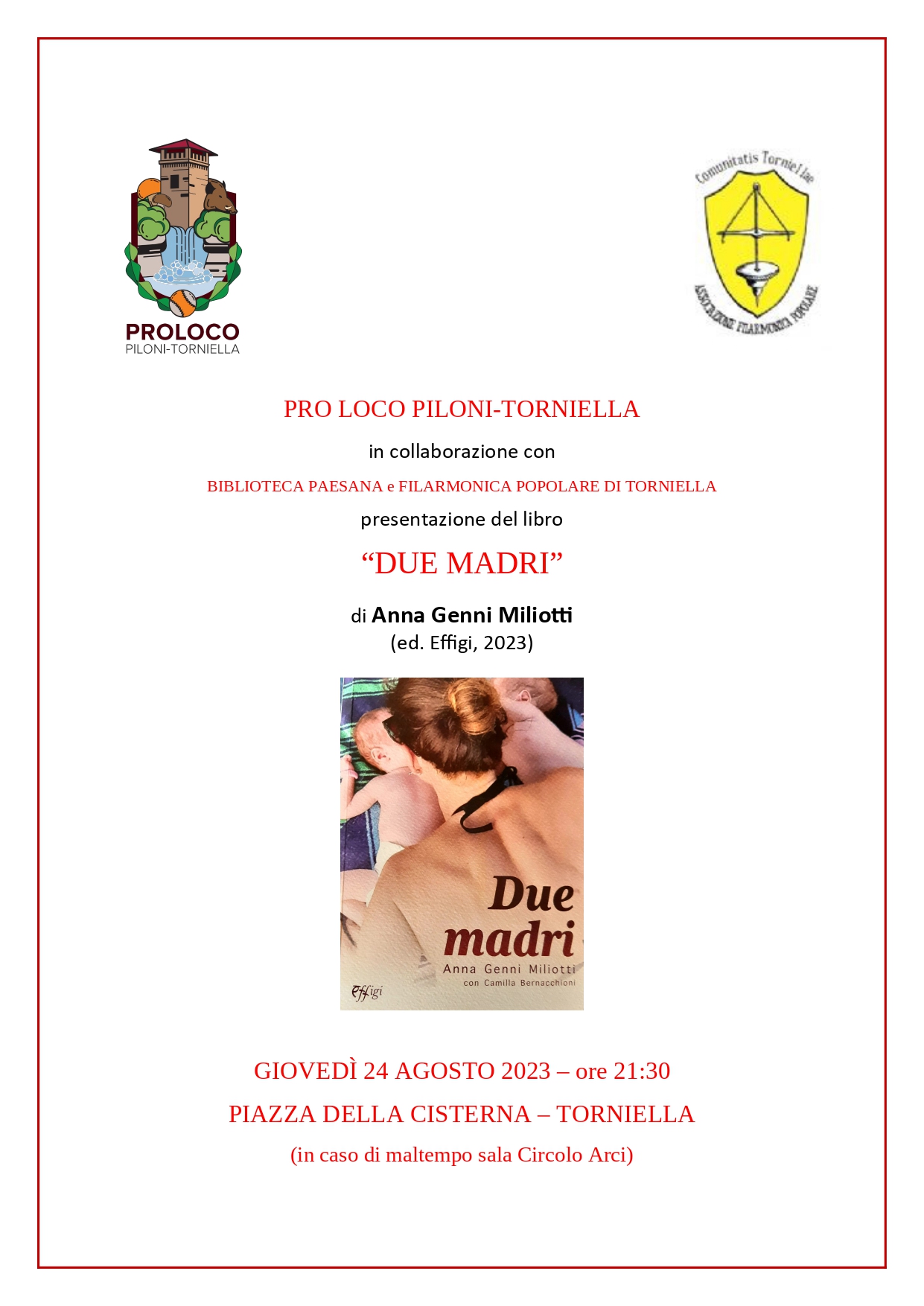 La Pro Loco Piloni - Torniella, in collaborazione con Biblioteca paesana e Filarmonica popolare di Torniella, organizza per il giorno Giovedi 24 agosto alle ore 21.30 in piazza della Cisterna a Torniella, la presentazione del libro "Due madri" di Anna Genni Miliotti.