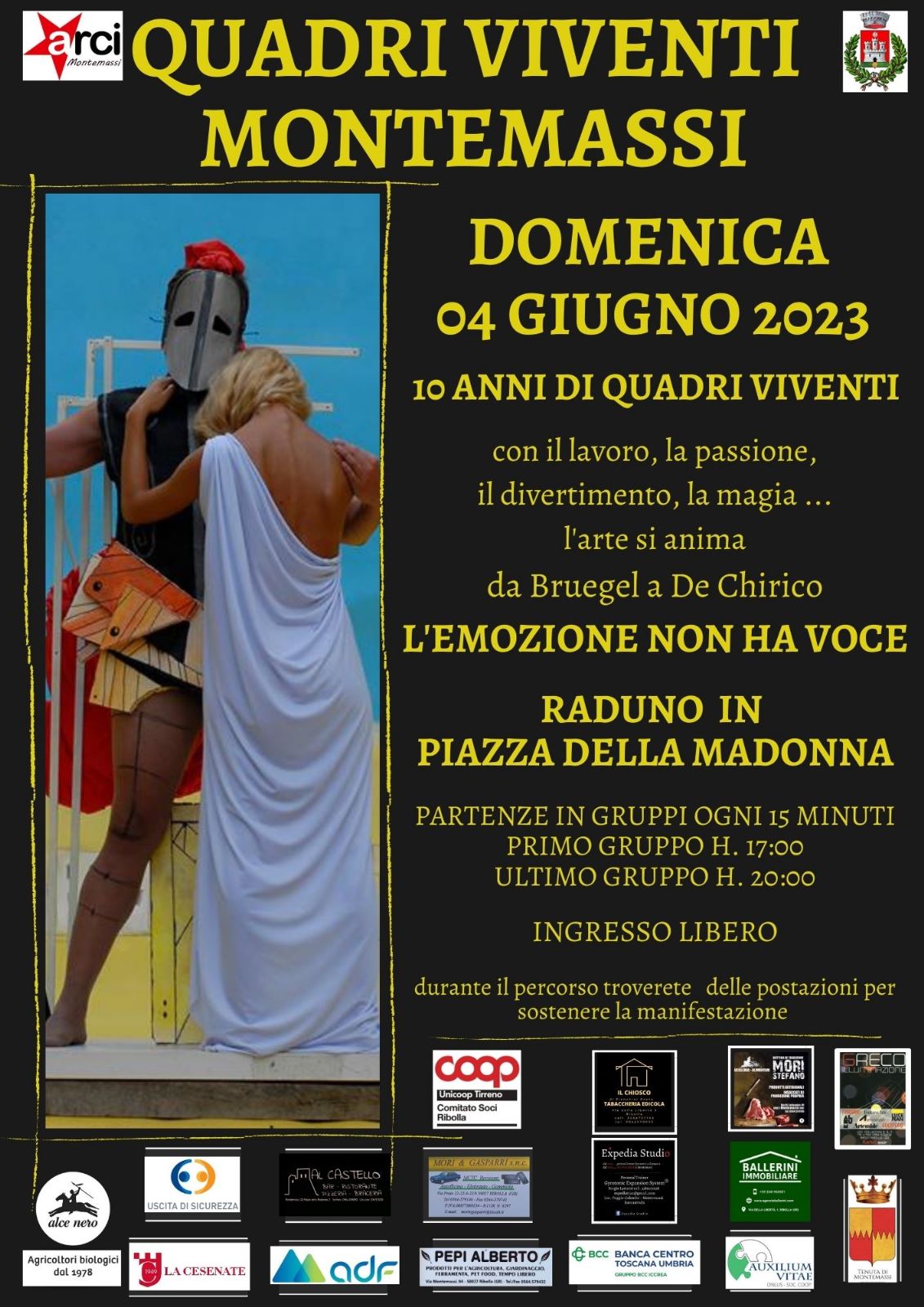 Con la 7° edizione del tradizionale appuntamento con "I Quadri Viventi" il borgo di Montemassi torna a trasformarsi in museo a cielo aperto, con decine di quadri "umani" ad animare le piazze, le vie, gli scorci e i panorami del paese.