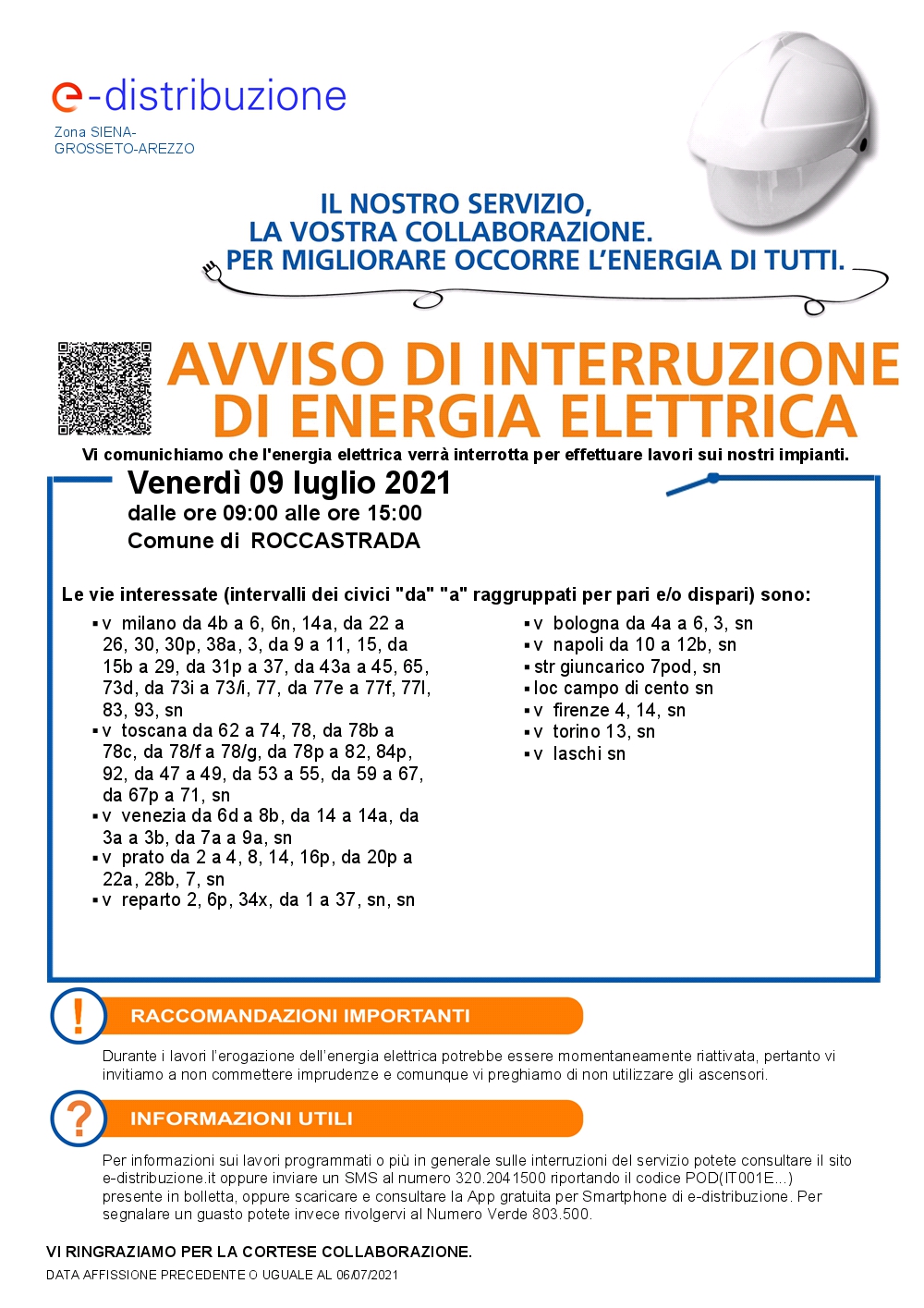 E-Distribuzione informa che nella giornata di Venerdi 9 luglio, con orario dalle 9.00 alle 15.00, è prevista una interruzione di energia elettrica in alcune zone della frazione di Ribolla.