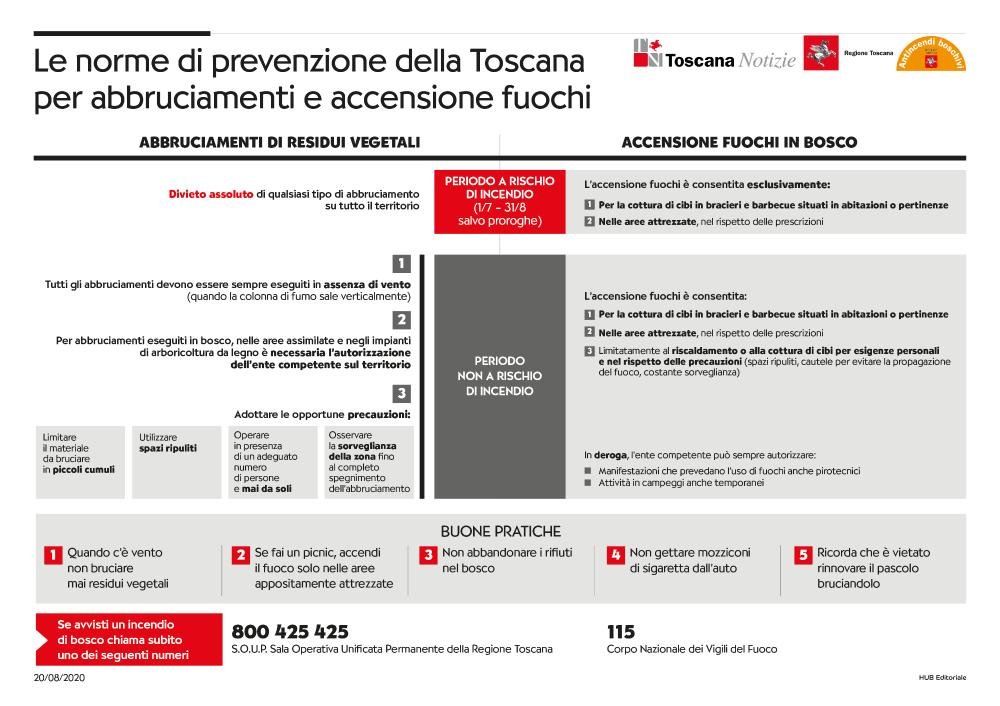 La Regione Toscana ha decretato la proroga del periodo a rischio incendi boschivi fino al 3 aprile 2022 compreso, con conseguente divieto assoluto di abbruciamento dei residui vegetali su tutto il territorio regionale. In tale “PERIODO A RISCHIO INCENDI” e negli altri periodi di massimo rischio per gli incendi boschivi, eventualmente individuati dalla Regione, vige il divieto assoluto di qualsiasi tipo di abbruciamento; non è consentito, pertanto, intraprendere attività di abbruciamento di residui vegetali, indipendentemente da orari e da distanze dal bosco.