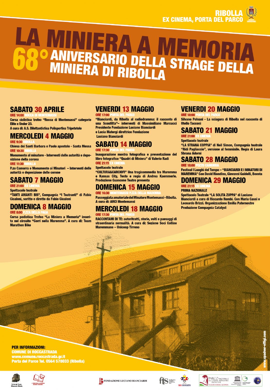 Informazioni. Per ulteriori informazioni sul cartellone “La miniera a memoria” è possibile contattare la Porta del Parco di Ribolla al numero 0564-578033 oppure il Comune di Roccastrada al numero 0564-561243 o 0564/561222. Il programma completo degli eventi può essere visionato sul sito istituzionale www.comune.roccastrada.gr.it