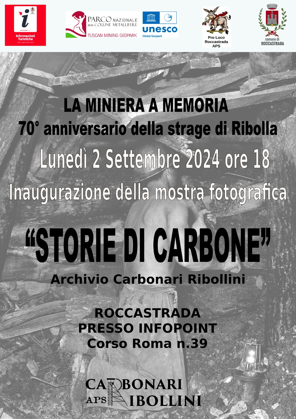 Lunedì 2 settembre alle ore 18:00, presso il nuovo Ufficio Informazioni e Accoglienza Turistica di Roccastrada in Corso Roma di fronte al palazzo comunale, alla presenza del Sindaco, del Presidente della Proloco di Roccastrada Giorgio Pistolesi, del presidente dell'Associazione Carbonari Ribollini nonchè curatore della mostra Stefano Gorelli e dell'assessore alla cultura Emiliano Rabazzi, si terrà l’inaugurazione della mostra fotografica “Storie di carbone”, un progetto realizzato dall’archivio dei Carbonari Ribollini. L'evento è realizzato grazie alla collaborazione tra l’Amministrazione Comunale, la Proloco di Roccastrada e l’Associazione Culturale Carbonari Ribollini APS.