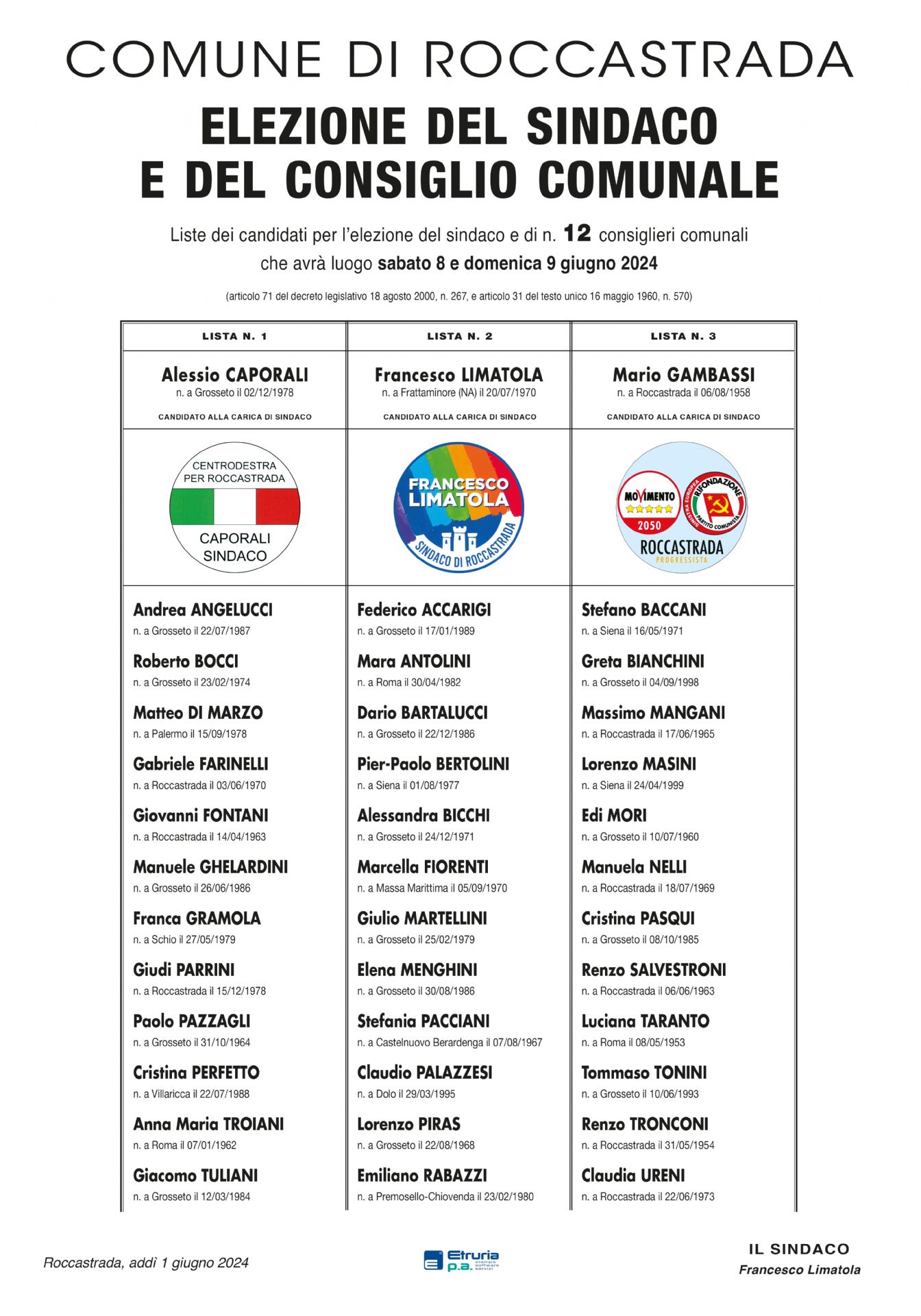 Liste dei candidati per lʼelezione del sindaco e di n. 12 consiglieri comunali che avrà luogo sabato 8 e 9 giugno 2024.