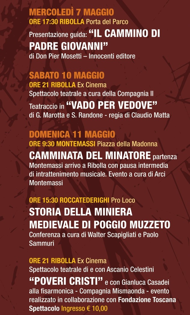 Domenica 11 maggio alle ore 9.30 con partenza da Piazza della Madonna a Montemassi “Camminata del minatore” da Montemassi a Ribolla. L’evento organizzato da ARCI Montemassi prevede una sosta ristoro a metà del percorso, improvvisazioni in rima con i poeti estemporanei ed in finale deposizione dei fiori al monumento al minatore.