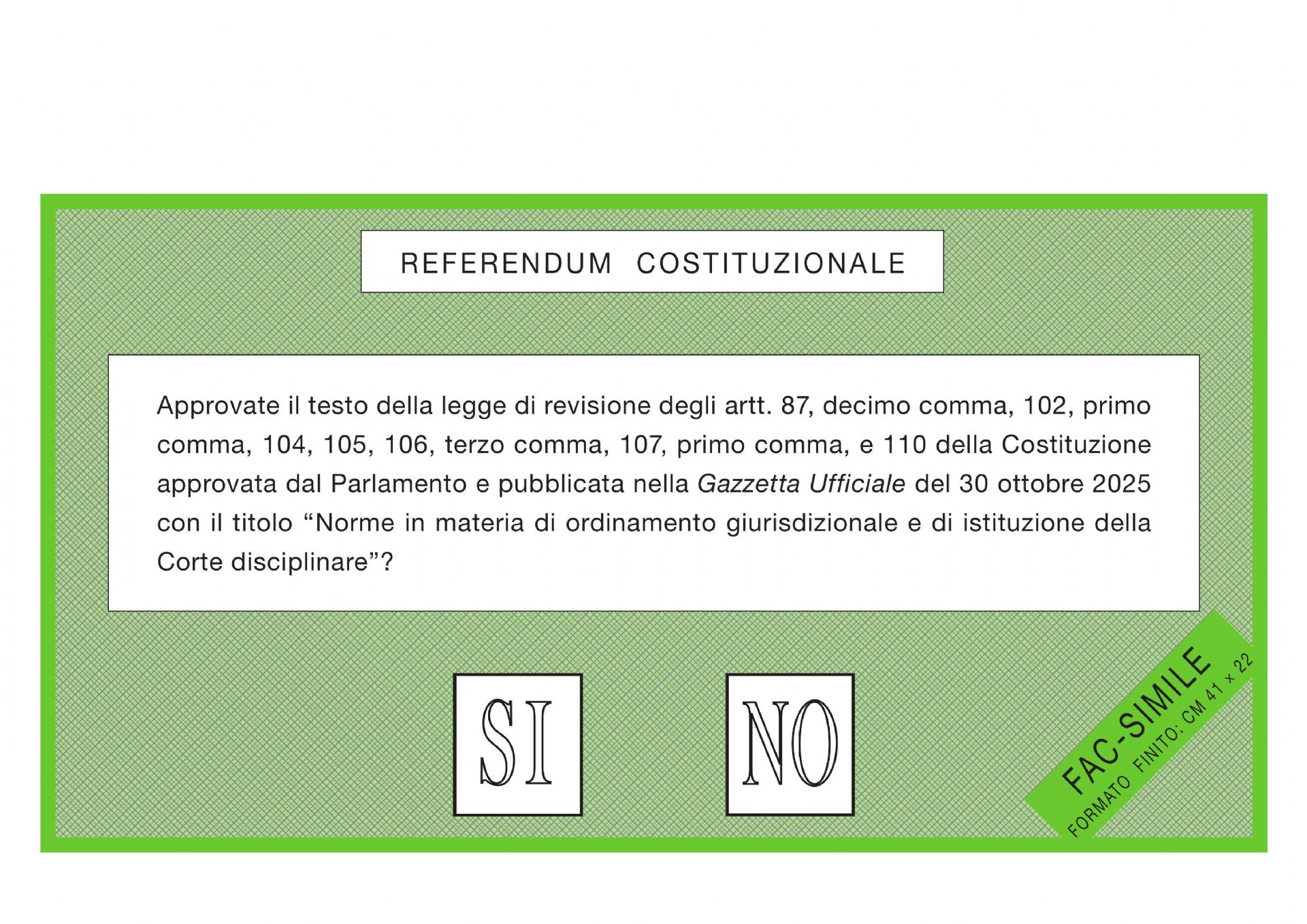 La scheda di voto che sarà consegnata agli elettori in occasione del referendum, che si svolgerà nelle giornate di domenica 22 e lunedi 23 marzo 2026 è di colore verde.