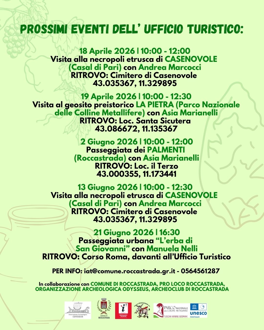 Martedi 2 giugno dalle 10.00 alle 12.00 passeggiata dei palmenti nel centro abitato di Roccastrada con Asia Marianelli con ritrovo in loc. Il Terzo; Sabato 13 giugno dalle 10.00 alle 12.30 visita alla necropoli etrusca di Casenovole con Andrea Marcocci con ritrovo al Cimitero di Casenovole; Domenica 21 giugno alle ore 16.30 Passeggiata urbana "L'erba di San Giovanni" nel centro abitato di Roccastrada con Manuela Nelli con ritrovo in Corso Roma, di fronte all’Ufficio Informazioni e Accoglienza Turistica.