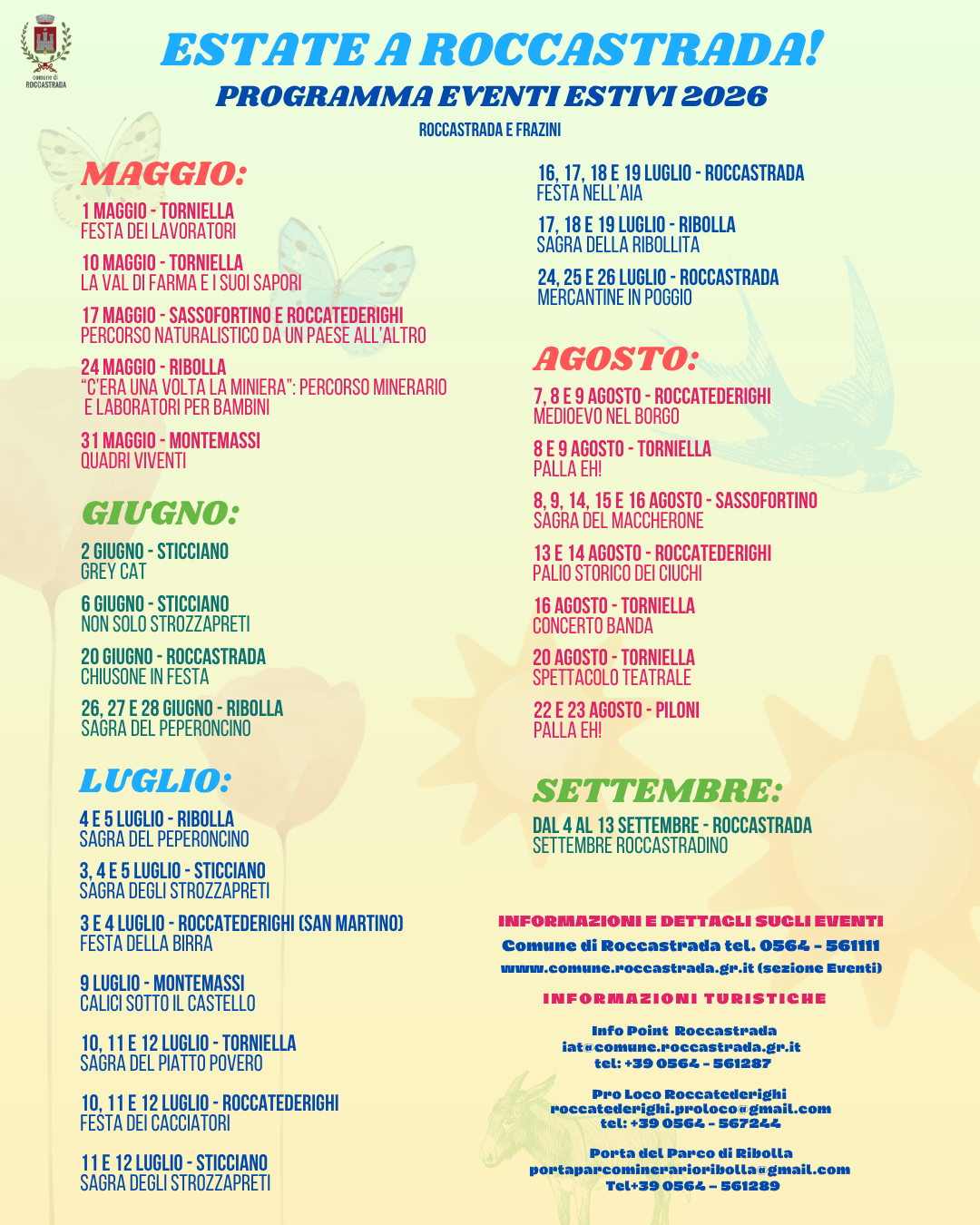 Un’offerta ampia e diversificata, pensata per coinvolgere un pubblico trasversale: famiglie, appassionati di cultura e amanti del buon vivere e dei prodotti tipici. Roccastrada si conferma come territorio importante e di riferimento per il turismo enogastronomico, pronta a regalare emozioni autentiche tra paesaggi unici, storia e sapori inconfondibili. Il calendario rappresenta al meglio lo spirito del nostro territorio capace di coniugare valorizzazione delle tradizioni e attenzione alla sostenibilità.
