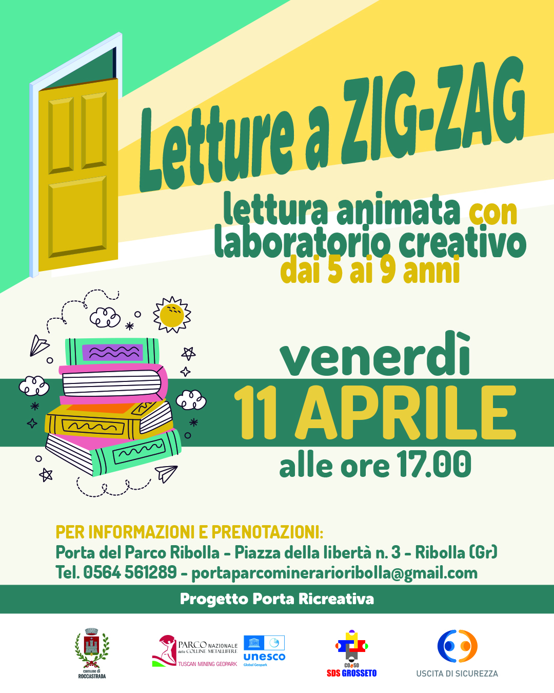 Alla Porta del Parco di Ribolla un progetto a cura della Porta Ricreativa, venerdi 11 aprile 2025 alle ore 17.00, "Letture a zig-zag", lettura animata con laboratorio creativo per bambini dai 5 ai 9 anni di età.