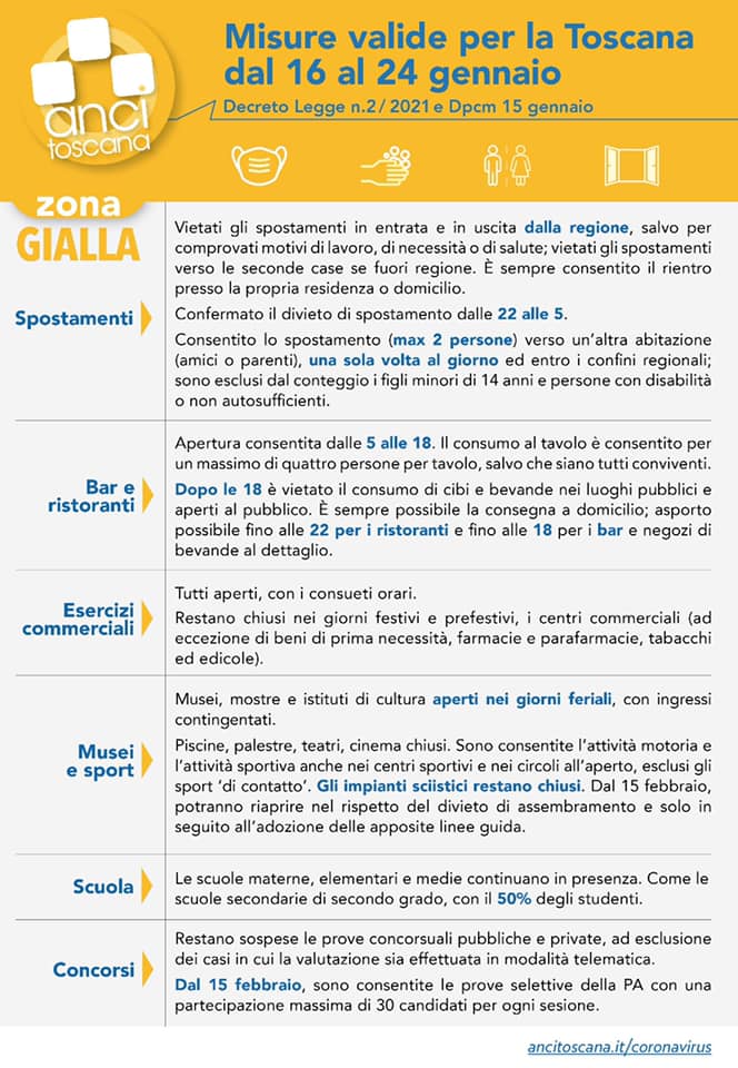 In questa scheda elaborata da ANCI TOSCANA un breve riepilogo delle misure valide dal 16 al 25 Gennaio per la nostra regione.
