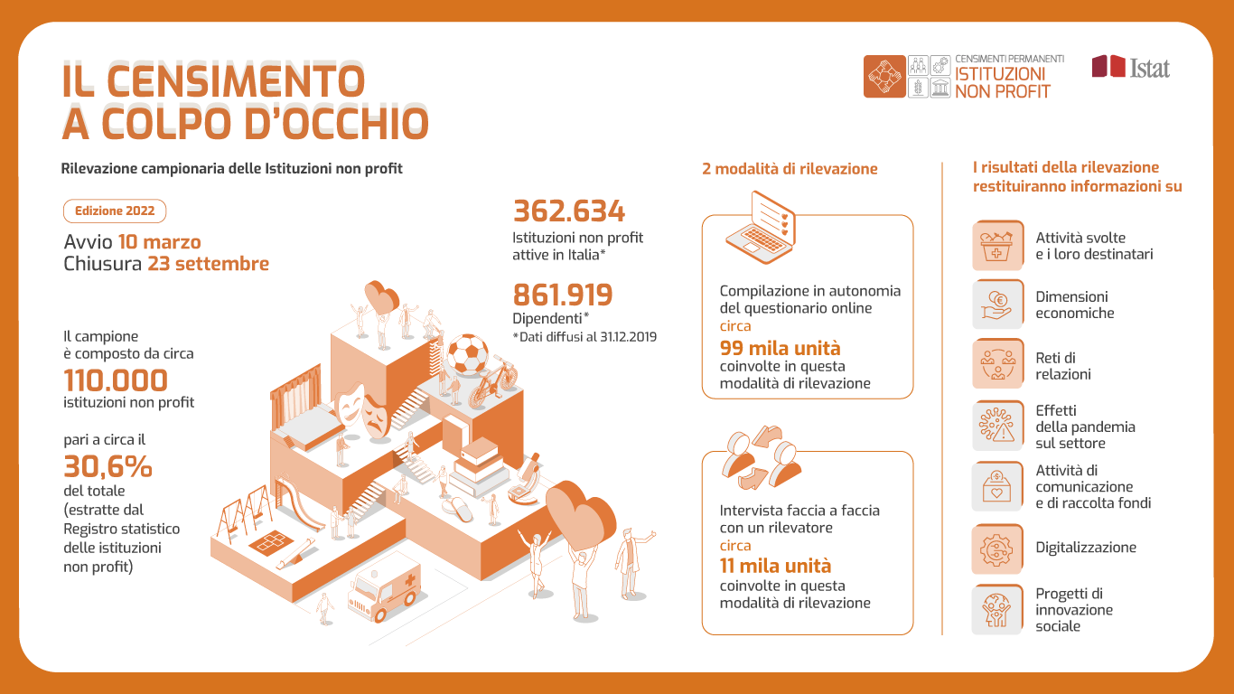 Il 10 marzo 2022 parte la rilevazione campionaria del Censimento permanente delle istituzioni non profit, che si concluderà il 23 settembre 2022.
