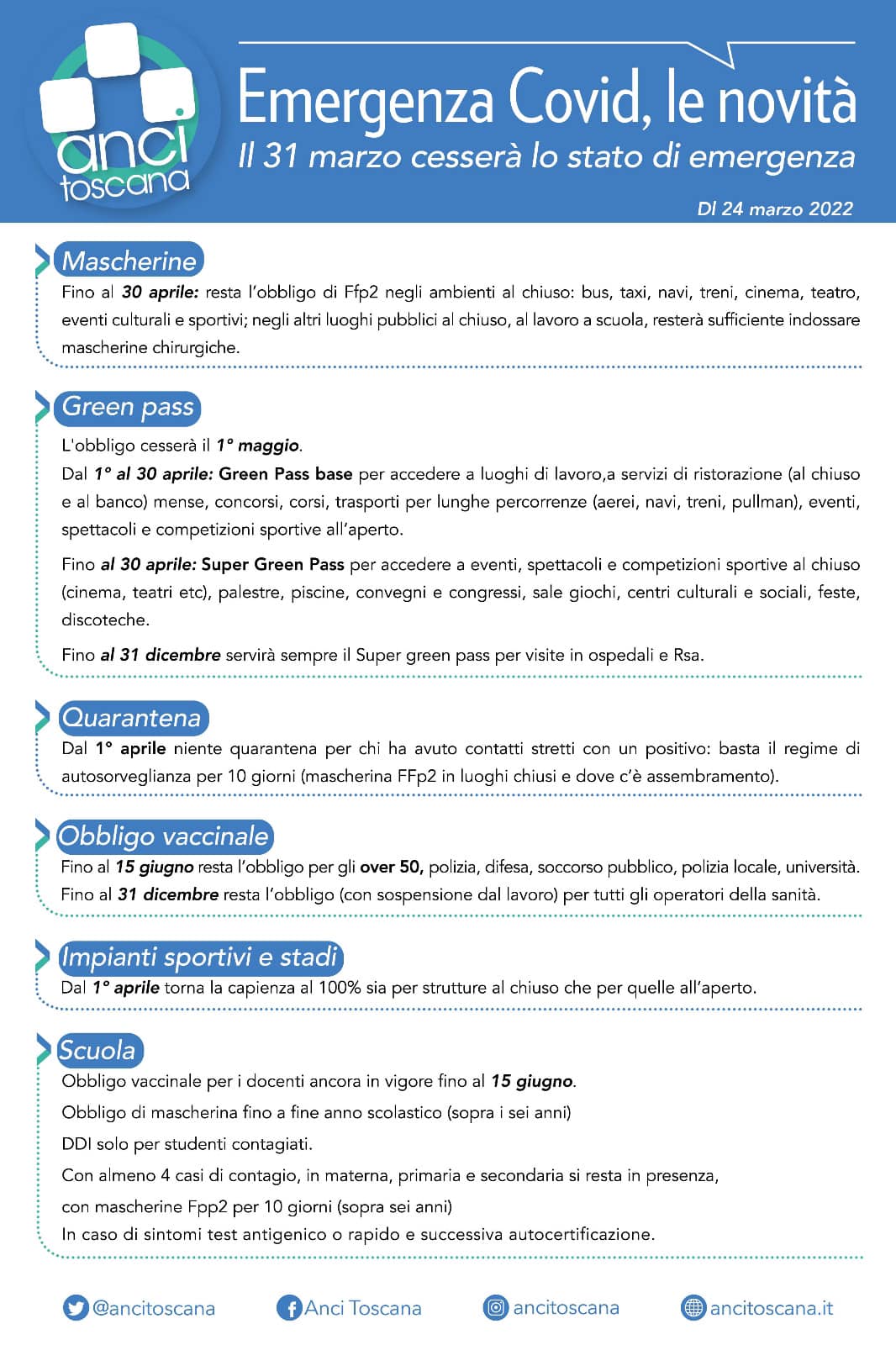 Ecco la scheda di Anci Toscana con le novità decise dal governo con la fine dello stato di emergenza.