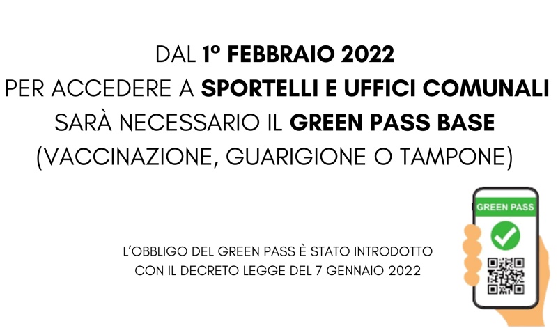 Il decreto legge del 7 gennaio 2022 ha introdotto, tra le altre, anche l’obbligo del green pass base (ottenibile anche tramite tampone) per accedere agli uffici pubblici. Dal 1° febbraio, fino alla data di cessazione dello stato di emergenza (attualmente fissata al 31 marzo 2022), l’accesso fisico agli uffici comunali è consentito soltanto se si è in possesso di green pass base (ricordiamo che per green pass base, si intende quello che attesta la vaccinazione, guarigione, test antigenico rapido o molecolare con risultato negativo al virus).