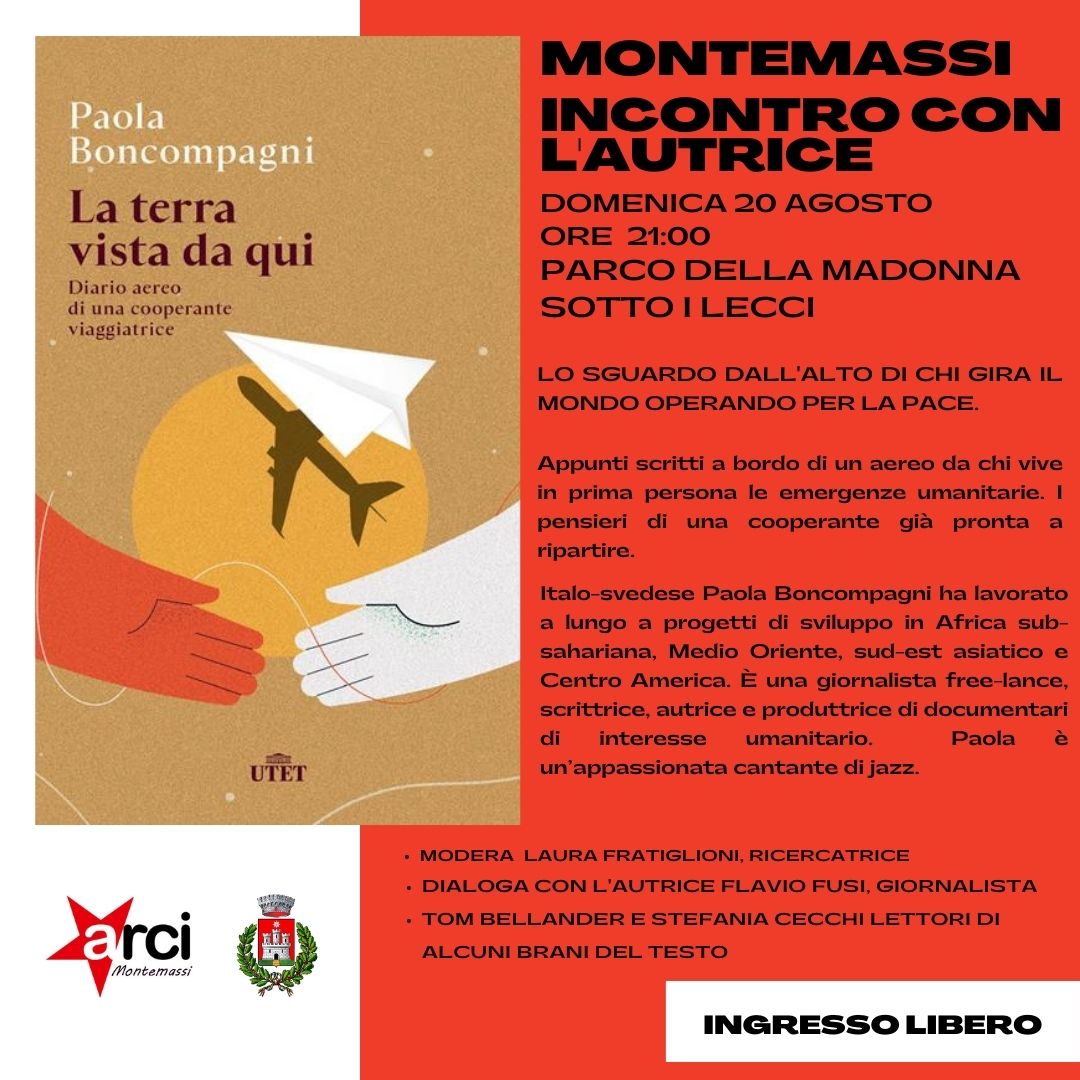 Paola Boncompagni presenterà il suo libro “La terra vista da qui. Diario aereo di una cooperante viaggiatrice”, edito da UTET, pubblicato nel 2021.