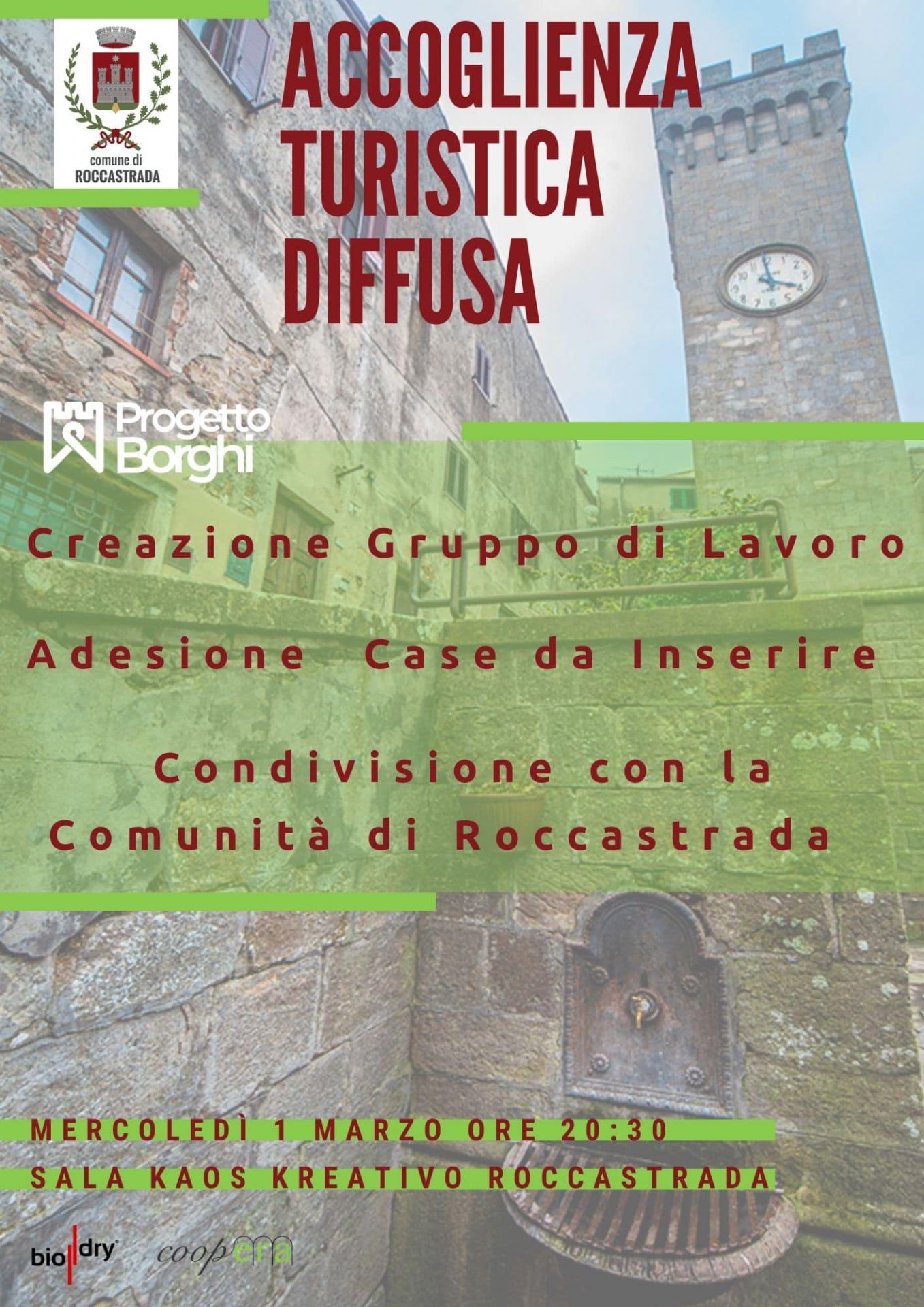 E’ previsto infatti nei locali del Kaos Kreativo in Piazza Dante Alighieri, un incontro per la creazione di un gruppo di lavoro e per la condivisione del progetto con la comunità di Roccastrada, al quale sono invitati a partecipare coloro che hanno già fornito la propria adesione, ma anche tutti i proprietari di alloggi e titolari di attività economiche interessati a far parte del progetto per la creazione di un’accoglienza turistica diffusa.