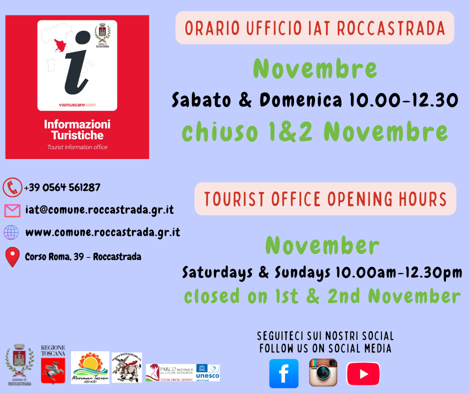 L'Ufficio Informazioni e Accoglienza Turistica di Roccastrada nella sua sede di Corso Roma di fronte al municipio rende note le aperture del mese di novembre.
